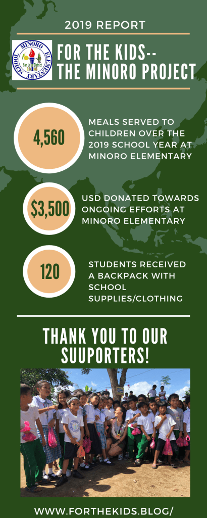 It’s hard to believe For the Kids was launched on January 2, 2019. As I reflect back on 2019 and everything we accomplished and my last visit for Minoro, I can’t help but get excited for the future and to continue making a big impact on so many children. In 2019, a little over $3,500 was raised For the Kids. We had 3 large goals we wanted to accomplish in 2019. One being to supply new tables and chairs for the younger students grade K-1st. This was quickly supported and accomplished within the first week. The second goal was supplying school supplies for the 2019 school year starting in July. We shipped two large boxes filled with school supplies identified as needs by the Minoro Administration, backpacks for each student, books, some clothing items and more. They were so grateful to receive these items to support their classrooms and curriculum for the school year.